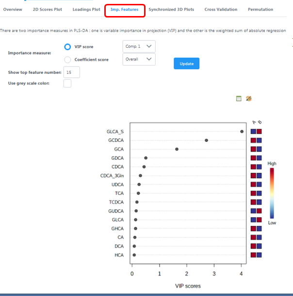 VIP ( Variable Importance in Projection scores )變量重要性投影,通過變量投影重要度衡量各代謝物組分含量對樣本分類判別的影響強度和解釋能力,輔助標(biāo)志代謝物的篩選。通常以VIP值>1作為篩選標(biāo)準。