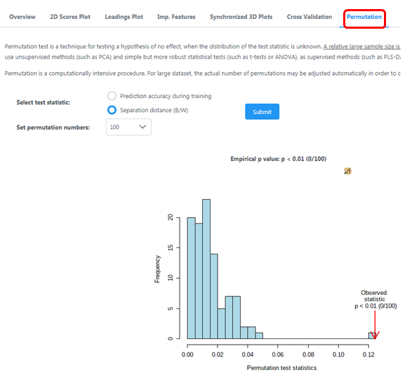 模型驗證permutation Test圖的橫坐標(biāo)表示模型的準確率,縱坐標(biāo)表示100次permutation Test中100個模型的準確率的頻數(shù),箭頭表示本PLS-DA模型準確率所在的位置。