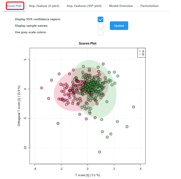 橫坐標(biāo)表示OSC過程中的主要成分的得分值( Tp ) ,所以從橫坐標(biāo)的方向可以看到組間的差異;縱坐標(biāo)表示OSC過程中的正交成分的得分值(TO),所以從縱坐標(biāo)上看出組內(nèi)的差異(組內(nèi)樣本間的差異)。