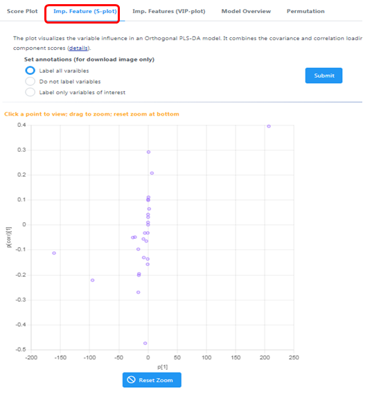 S-plot圖一般用來挑選與OSC過程中主要成分的相關(guān)性比較強的代謝物,從另一方面同時也可以挑選與Y相關(guān)性強的代謝物。越靠近兩個角的代謝物重要度越強。