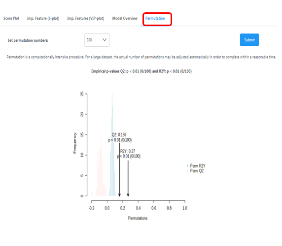 模型驗證permutation Test圖的橫坐標(biāo)表示模型的準確率,縱坐標(biāo)表示100次permutation Test中100個模型的準確率的頻數(shù),箭頭表示本OPLS-DA模型準確率所在的位置。其中R2X和R2Y分別表示所建模型對X和Y矩陣的解釋率,Q2表示模型的預(yù)測能力,理論上R2、Q2數(shù)值越接近1說明模型越好,越低說明模型的擬合準確性越差。通常情況下, R2、Q2高于0.5較好,高于0.4即可接受。