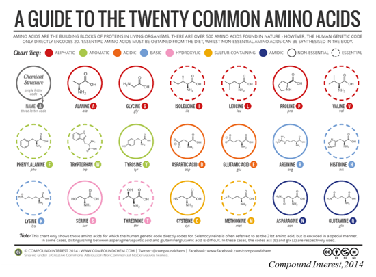 氨基酸是生物體蛋白質(zhì)的最基本組成部分,是構(gòu)成生物體蛋白質(zhì)的基本單位,在生物體的生命活動中發(fā)揮不可或缺的作用,其中組成蛋白質(zhì)的氨基酸共約20種。通常情況下,健康個體的氨基酸在體內(nèi)的分布處于一個平衡狀態(tài),氨基酸狀態(tài)的失衡是眾多疾病的誘因或表現(xiàn)形式。20種蛋白質(zhì)氨基酸在營養(yǎng)學(xué)上可分為必需氨基酸、條件必需氨基酸和非必需氨基酸,其中8種為必需氨基酸,在結(jié)構(gòu)上可根據(jù)側(cè)鏈基團(tuán)R的不同分為:非極性氨基酸(疏水氨基酸)和極性氨基酸(親水氨基酸),或根據(jù)化學(xué)結(jié)構(gòu)不同分為:脂肪族、芳香族、雜環(huán)族。下圖為20種氨基酸的分類(Compound Interest, 2014)