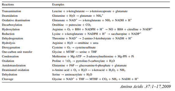 1.氨基酸脫氨基作用:脫氨基方式主要有氧化脫氨基、非氧化脫氨基、轉(zhuǎn)氨基和聯(lián)合脫氨基作用,其中聯(lián)合脫氨基作用是體內(nèi)最主要的脫氨基方式,氨基酸脫氨后生成α-酮酸再進(jìn)一步代謝:1)氨基化生成氨基酸2)經(jīng)糖異生途徑生成葡萄糖或轉(zhuǎn)變?yōu)橹?)進(jìn)入三羧酸循環(huán)氧化分解供能。
