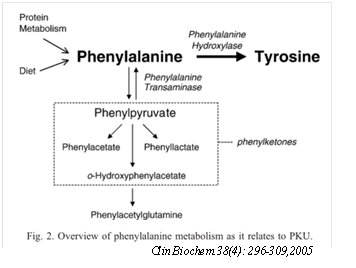 苯丙酮尿癥(PKU)是由于缺乏苯丙氨酸羥化酶而引起的苯丙氨酸代謝缺陷。苯丙氨酸羥化酶直接影響苯丙氨酸Phe向酪氨酸Tyr的轉(zhuǎn)化,因此用Phe濃度的增加量除以Tyr的減少量的更適用于反映PKU,苯丙氨酸與苯丙酮尿癥之間的代謝關(guān)系如下圖(Chace and Kalas et al, 2005)。