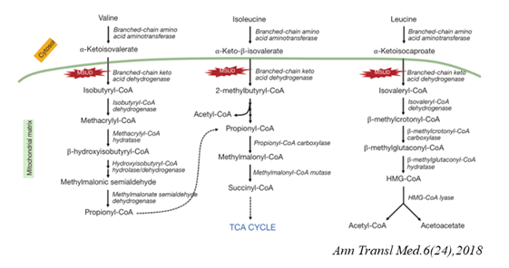楓糖漿尿。∕SUD)是一種支鏈氨基酸(BCAA)分解代謝疾病,MSUD可在新生兒篩查中檢測到,患有MSUD的新生兒血漿中纈氨酸、亮氨酸和異亮氨酸以及l(fā)-異亮氨酸(是MSUD的特征性標(biāo)志物)顯著升高。支鏈氨基酸的分解代謝與楓糖漿尿病的關(guān)系如下圖(Aliu et al, 2018)。