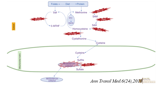圖6:含硫氨基酸代謝與多種先天性代謝疾。–BS,胱硫氨酸-合成酶;HCY,高胱氨酸尿;MeCbl甲基鈷胺素;MAT,甲硫氨酸s -腺苷轉(zhuǎn)移酶;SAM,S-腺苷甲硫氨酸;SAH,S-腺苷高半胱氨酸;SAHH,S-腺苷高半胱氨酸水解酶;MTHFR,亞甲基四氫葉酸還原酶;THF,四氫葉酸;SUOX,亞硫酸鹽氧化酶)