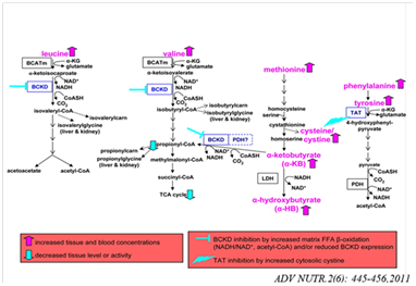 對某些必需氨基酸來說,胰島素作用受損、游離脂肪酸增加以及線粒體氧化還原狀態(tài)的變化,會削弱某些分解代謝途徑,進(jìn)而影響支鏈氨基酸、含硫氨基酸、酪氨酸、苯丙氨酸和相關(guān)衍生物的濃度(Adamset al, 2011)。