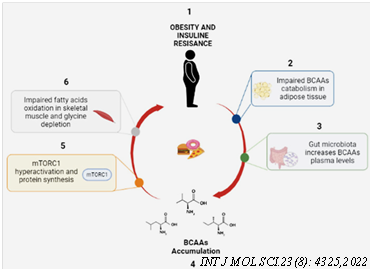 長期攝入BCAA與非BCAA氨基酸比例失衡會引發(fā)食欲失調(diào)/暴食癥。BCAA與肥胖的關(guān)系:(1)肥胖和胰島素抵抗會改變BCAAs的分解代謝;(2)脂肪組織中BCAAs分解代謝障礙;(3)腸道菌群會增加BCAA水平;(4)進(jìn)而引起B(yǎng)CAA積累;(5)BCAA過度激活mTORC1信號和蛋白質(zhì)合成,抑制脂肪的分解;(6)骨骼肌中脂肪酸氧化受損和甘氨酸耗竭。(Cuomo et al, 2022)