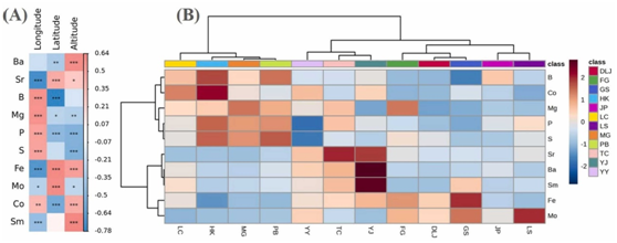 對58種元素與經度、緯度、海拔高度進行相關性分析。相關系數等于或大于0.5且p值小于0.05作為報告數據的限值。如圖4A所示,經度與B、Mg、P、S、Co呈正相關,與Sr、Fe、Sm呈負相關。緯度與Sr、Fe、Mo呈正相關,與Ba、B、Mg、P、Co呈負相關。海拔與Ba、Sr、Fe、Co、Sm呈正相關,與Mg、P、S、Mo呈負相關。涉及的元素有十種,其中B、Mg、P、Fe、Mo各占一半,為必需元素,Sm為鑭系元素,隨后進行層次聚類分析,采用Pearson距離和ward聚類方法,結果如圖4B所示,很難將其與地理起源聯系起來,表明草果種子中元素的積累不僅受位置的影響,還受土壤、氣候等其他因素的影響。