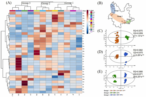 根據“80%規則”,超過80%樣本中,質量分數已知的32種元素(Li、B、Na、Mg、Al、Si、P、S、K、Ca、V、Cr、Mn、Fe、Co、Ni、Cu、Zn、Ge、As、Rb、Sr、Mo、Ag、Cd、Sn、Cs、Ba、La、Ce、W、Pb)用于進一步層次聚類分析如圖5A所示。來自12個種群的樣本被分為三類。第1組包括LC、YJ、TC、JP和YY。第2組包括PB、HK和MG。第3組由DLJ、GS、FG和LS組成。除了JP外,與之前關于草果種子精油與局部生長之間相關性的研究中顯示的模式相似。根據植物區系理論,JP與PB、HK和MG(第2組)一起位于II區。然而,JP在地理上比PB更接近YY(圖 5B),需要在以后的研究中給予更多的關注。然后通過OPLS-DA分析,結果表明組1 vs組2、組1 vs組3、組2 vs組3均有顯著差異,Q2大于0.95 和p值小于5.25×10-23(圖 5C-E)。這意味著這32個元素可用于構建草果種子地理鑒定的指紋識別模型。