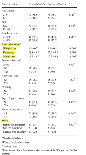 病例組和對照組在孩子的出生信息方面存在顯著差異,包括體重(p<0.001)、孩子出生時父親的年齡(p<0.001)、母親的年齡(p<0.001)以及母親孕期的情緒狀況(p=0.007),其他人口統計特征沒有觀察到顯著差異(表1)。