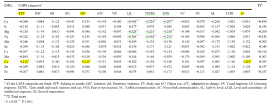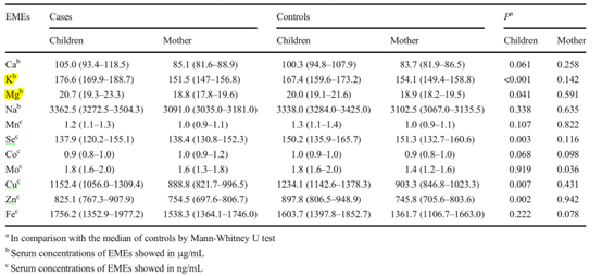 這項病例對照研究評估了中國人群中11種EMEs與ASD之間的關系。在所有受試者中都檢測到了11種EMEs。結果表明,較低濃度的Cu和Zn以及較高濃度的Ca、K和Mg與ASD的風險增加相關,并且上述大多數EME與疾病嚴重程度(CARS評分)相關。此外相關性分析表明,病例組和對照組之間EMEs的分布和概況是不同的,在病例組和對照組中分別發現了6對和7對母親和孩子血清EMEs濃度之間的特定相關性。總的來說,這項研究表明血清中 EMEs 有潛力作為 ASD 的生物標志物,用于提升目前的診斷和治療方法。