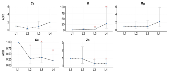 ASD風險和EMEs濃度之間的關聯強度通過Logistic回歸計算的優勢比(ORs)來量化。研究結果表明,在調整和不調整潛在混雜因素的情況下,較低濃度的Cu和Zn以及較高濃度的Ca、K和Mg濃度與ASD的風險增加有關(表3)。作者通過計算EMEs各四分位數的OR值,研究11個EMEs與ASD風險的劑量-反應關系,隨著Ca、K和Mg水平的增加以及Cu和Zn水平的降低,兒童患自閉癥的風險增加(圖1)。