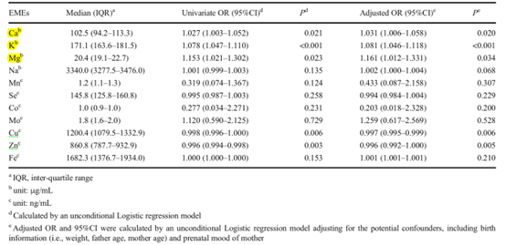 金屬元素失衡可能導致生物機能障礙和神經系統損傷,被認為與ASD的病理生理過程有關。據報道鋅(Zn)參與shank家族中與ASD關系最密切的神經配體蛋白和Shank3蛋白的抗氧化過程和結合過程,另有研究表明血液中鈉(Na)、鈣(Ca)和鉀(K)的異常濃度與氧化應激有關,并與ASD的發病有關。然而,過去的研究存在如下問題:發現金屬元素與ASD之間的關聯并不一致;以往的研究樣本量相對較小;缺乏ASD在中國人群中的研究。母親體內的EMEs濃度對兒童有很大影響,需要對未服用藥物的ASD中國兒童及其母親進行大規模和更全面的研究。