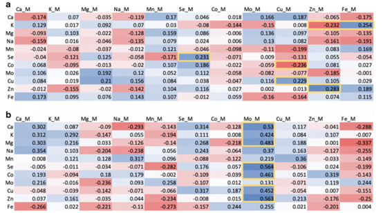 對于母親和兒童,病例組和對照組的總體相關性趨勢有很大不同,在病例組中出現了六個特定的相關配對,Se(母親)-Se(子女)、Cu(母親)-Co(子女)、Cu(母親)-Cu(子女)、Zn(母親)-K(子女)、Zn(母親)-Zn(子女)、Fe(母親)-K(子女)。對照組中出現了七個特定的相關配對Mo(母親)-Ca、K、Mg、Se、Co、Mo、Cu(子女)。