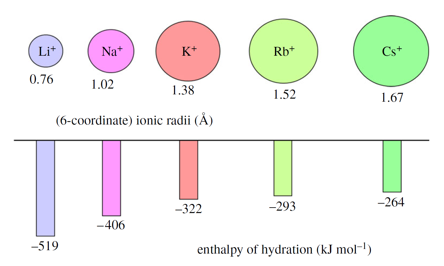 鋰(Li, Z = 3)不是必需元素,但是在某些自然界中的水里以Li+的形式存在,尤其是溫泉水和一些商業瓶裝礦泉水。人體內有約2.4 mg Li,也許低劑量的鋰對人體有益。在醫藥領域,鋰鹽被廣泛用于治療雙向情感障礙。Li+是一個非常小的離子(離子半徑0.76 Å),具有較高的水化熵(−519 kJ mol−1)。