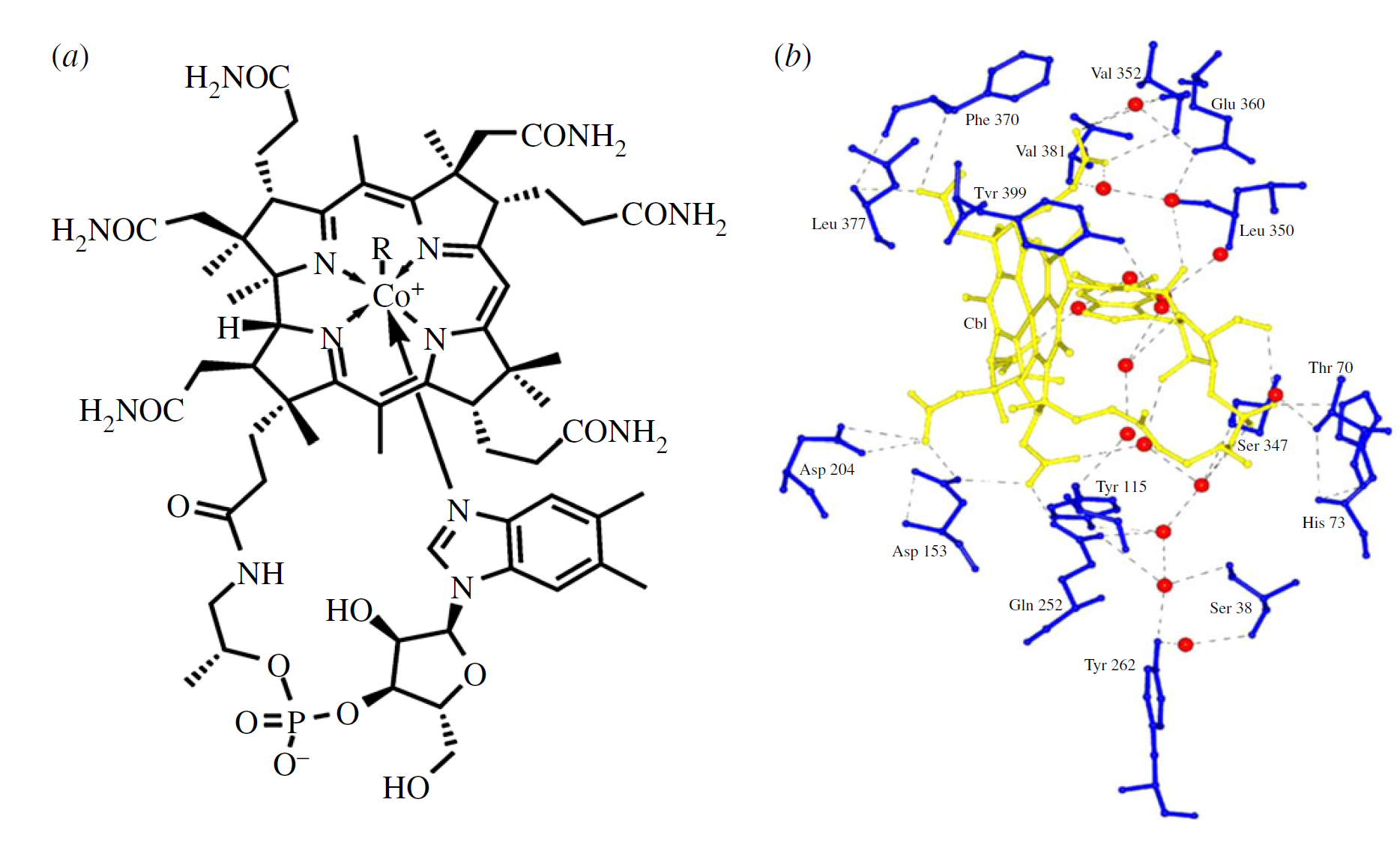 圖3. (a)維生素B12的結(jié)構(gòu),以CoIII corrin復(fù)合物表示 ;(b)周圍環(huán)境中鈷胺素(黃色)與內(nèi)因結(jié)合位點(diǎn),產(chǎn)生糖蛋白并在小腸中吸收維生素B12