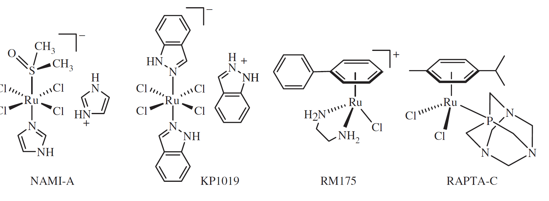 圖6. 一些RuIII和RuII抗癌復(fù)合物。NAMI-A和KP1019(如鈉鹽NKP-1339和IT-139)都在進(jìn)行臨床試驗(yàn)