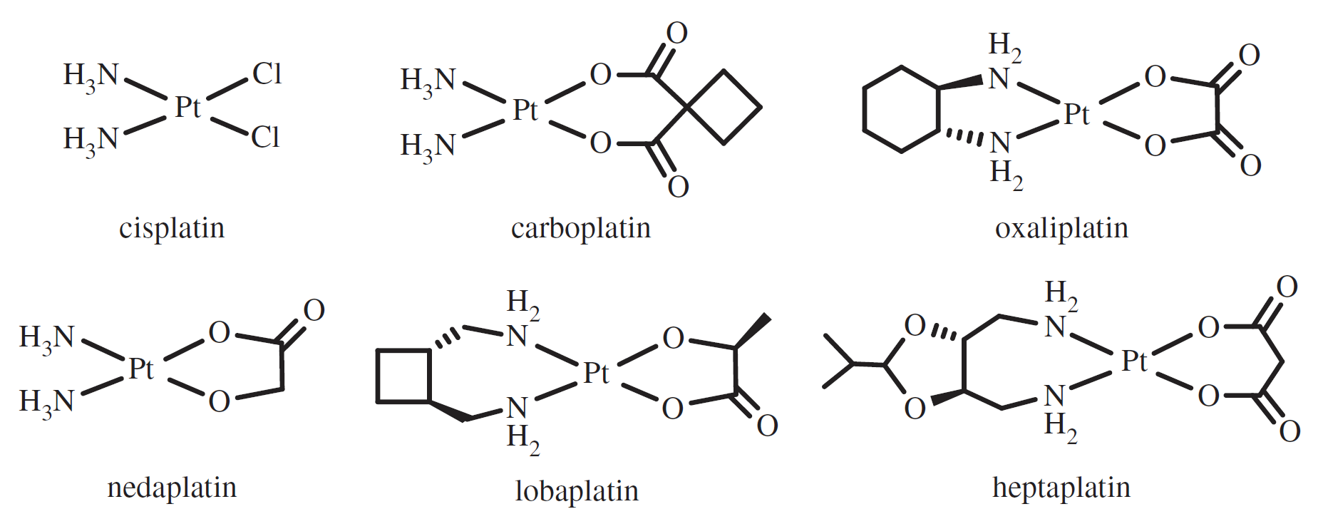 目前應(yīng)用最廣泛的癌癥化療藥物是鉑(Pt, Z = 78)復(fù)合物,現(xiàn)在占所有治療的50%。最初的藥物是順鉑cis-[PtCl2(NH3)2]起源于20世紀(jì)60年代密歇根州立大學(xué)的Barnett Rosenberg實(shí)驗(yàn)室,現(xiàn)在已經(jīng)加入了它的類似物卡鉑順-[Pt(1,1-二羧基環(huán)丁烷)(NH3)2]和奧沙利鉑[Pt(1R, 2r -1,2-二氨基環(huán)己烷)(草酸)]已經(jīng)得到了全世界的認(rèn)可。奈達(dá)鉑、洛鉑和七鉑獲批用于日本、中國(guó)和韓國(guó)。脂鉑,由順鉑和由二蛋酰磷脂酰、大豆磷脂酰膽堿(SPC-3)、膽固醇和膽固醇組成的脂質(zhì)體甲氧基聚乙二醇-雙硬脂酰磷脂乙醇胺(mPEG2000-DSPE)完成III期臨床試驗(yàn)。高正電荷的Pt2和Pt3配合物形成了一種有趣的新型強(qiáng)效劑。