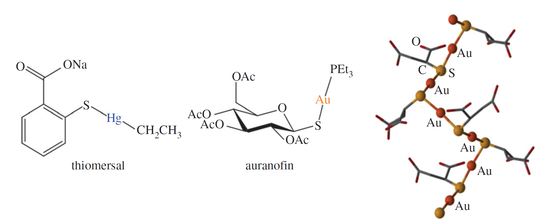 圖8. 抗菌HgII劑硫柳汞,口服抗關(guān)節(jié)炎藥物金硫芬和可注射抗關(guān)節(jié)炎AuI藥物原硫酸鹽(心肌素) 的聚合物結(jié)構(gòu)。