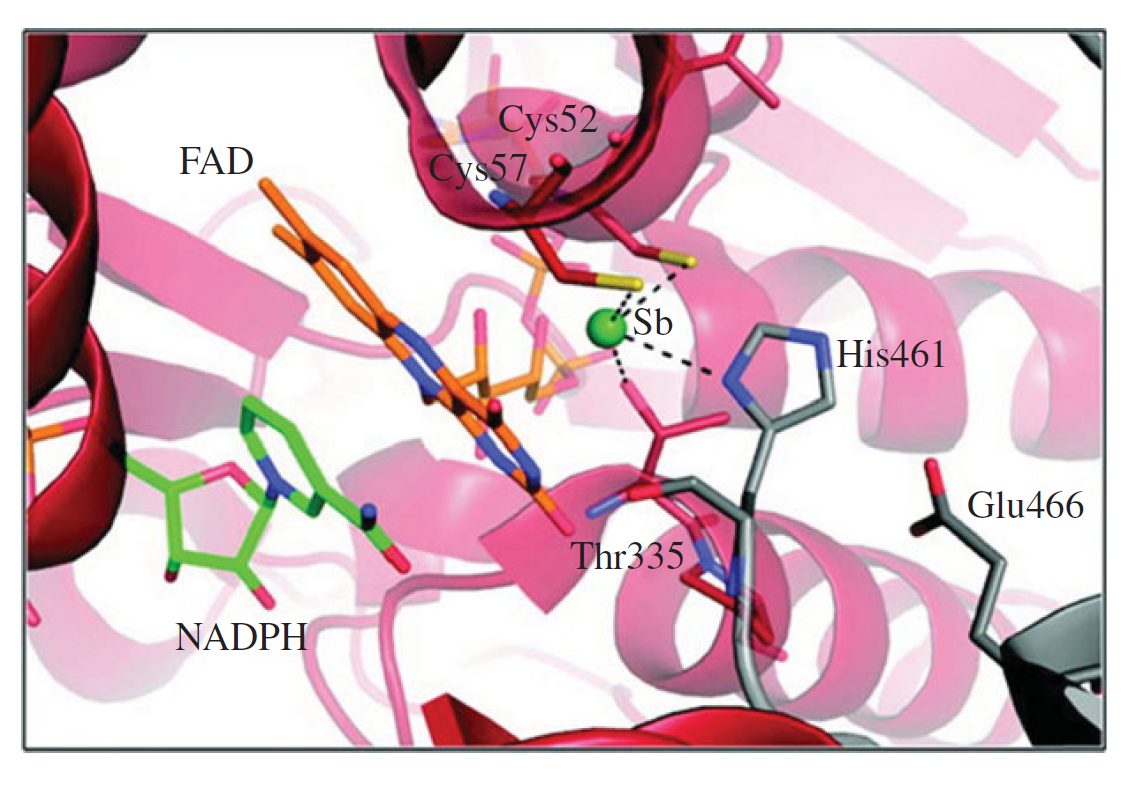 圖3. 嬰兒利什曼原蟲的還原錐蟲硫胱甘肽還原酶與NADPH和SbIII結(jié)合