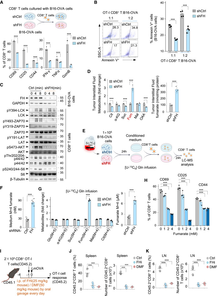 腫瘤特異性FH的缺失阻斷CD8+ T細(xì)胞中的T細(xì)胞抗原受體信號(T cell antigen receptor,TCR)激活,抑制了腫瘤浸潤性CD8+ T細(xì)胞的功能。研究推測FH缺失的腫瘤細(xì)胞可能在微環(huán)境中積累富馬酸從而抑制TME中CD8+ T細(xì)胞的激活。作者用[U-13C5]谷氨酰胺處理的FH缺失或正常表達(dá)的B16細(xì)胞的條件培養(yǎng)基培養(yǎng)CD8+ T細(xì)胞,進(jìn)行了13C代謝流分析(圖1E)。與對照細(xì)胞相比,來自FH缺失腫瘤細(xì)胞的培養(yǎng)基顯示13C標(biāo)記的富馬酸增加(圖1F),與用FH正常表達(dá)的B16培養(yǎng)基培養(yǎng)的T細(xì)胞相比,用FH缺失的B16培養(yǎng)基培養(yǎng)的T細(xì)胞中,13C標(biāo)記的富馬酸水平明顯更高(圖1G)。相比之下,來自[U-13C5]谷氨酰胺的其他TCA循環(huán)代謝物的水平在這些CD8+ T細(xì)胞中幾乎保持不變(圖1G)。這些結(jié)果表明,F(xiàn)H缺失的腫瘤細(xì)胞微環(huán)境中富馬酸確實(shí)積累了,進(jìn)一步提示腫瘤特異性FH缺失可能通過富馬酸抑制微環(huán)境中的CD8+ T細(xì)胞。為了驗(yàn)證這種可能性,作者評估了TCA循環(huán)中代謝物對CD8+ T細(xì)胞的影響,發(fā)現(xiàn)添加富馬酸而不是其他TCA循環(huán)代謝物,導(dǎo)致CD8+ T細(xì)胞中CD69、CD25和CD44的表達(dá)減少,富馬酸或富馬酸酯處理以劑量依賴的方式減弱CD8+ T細(xì)胞的活化(圖1H)。