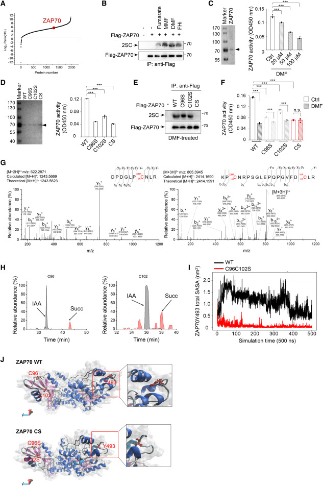 圖2. 確定C96和C102(C96/C102)為決定ZAP70活性的富馬酸琥珀酸化位點(diǎn)
