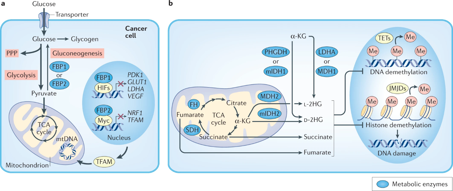 草酰乙酸、琥珀酸、富馬酸和2-羥基戊二酸:美國西北大學(xué)范伯格醫(yī)學(xué)院Navdeep S. Chandel團(tuán)隊(duì)2021年10月于Nature Reviews Cancer上發(fā)表了題為“Cancer metabolism: looking forward”的綜述(DOI: 10.1038/s41568-021-00378-6),概述了腫瘤代謝領(lǐng)域的最新研究進(jìn)展。在過去十年,TCA循環(huán)再次成為支持腫瘤生長的關(guān)鍵合成代謝中心。丙酮酸羧化酶(PC)催化丙酮酸產(chǎn)生TCA循環(huán)代謝物草酰乙酸,已被證明是原發(fā)和轉(zhuǎn)移性腫瘤生長所必需的。此外,從草酰乙酸生成的天冬氨酸及其衍生物天冬酰胺都可以限制腫瘤的生長。在特定的腫瘤中,編碼琥珀酸脫氫酶(SDH)、富馬酸水合酶(FH)以及異檸檬酸脫氫酶1或2(IDH1或IDH2)的基因發(fā)生功能缺失突變,會(huì)造成腫瘤中代謝產(chǎn)物琥珀酸、富馬酸和2-羥基戊二酸(2HG)的濃度增加,這些代謝物是導(dǎo)致不同癌癥的誘因,因此被稱為“腫瘤代謝物”。這三種腫瘤代謝物中任何一種的積累已被證明有助于惡性腫瘤的發(fā)展,但僅限于某些組織。原因是這些代謝物與α-酮戊二酸(α-KG)結(jié)構(gòu)相似從而競爭性抑制α-KG依賴的雙加氧酶(α-KGDDs)包括組蛋白去甲基酶、RNA去甲基酶等從而調(diào)節(jié)表觀遺傳修飾,影響基因表達(dá)。