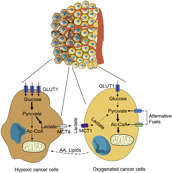 乳酸:賓夕法尼亞大學(xué)M. Celeste Simon團(tuán)隊(duì)2020年6月在Developmental Cell上發(fā)表了題為“Cancer Cells Don’t Live Alone: Metabolic Communication within Tumor Microenvironments”的綜述(DOI: 10.1016/j.devcel.2020.06.018),概述了原發(fā)和轉(zhuǎn)移性TME中腫瘤細(xì)胞和不同間質(zhì)成分之間代謝通信的最新進(jìn)展。在非小細(xì)胞肺癌中,曾被認(rèn)為是代謝廢物的乳酸比葡萄糖更適合作為TCA循環(huán)的底物。在這種情況下,乳酸和葡萄糖是并行利用的,因?yàn)槿樗峥梢酝ㄟ^線粒體LDH活性直接進(jìn)入TCA循環(huán)。通過LDHA的乳酸代謝也可能影響胞質(zhì)氧化還原狀態(tài),并將葡萄糖重定向到戊糖磷酸途徑和己糖胺的生物合成。乳酸作為一種信號分子,可能會(huì)改變細(xì)胞內(nèi)的信號通路和/或基因表達(dá),從而影響葡萄糖的攝取和分解代謝。腫瘤腔內(nèi)的癌細(xì)胞相互協(xié)作,形成代謝“共生”,乳酸穿梭是一個(gè)例子,在缺氧區(qū)域的癌細(xì)胞通過厭氧糖酵解消耗葡萄糖并釋放乳酸,然后乳酸被鄰近富氧腫瘤區(qū)域的癌細(xì)胞用作TCA循環(huán)的底物。抗血管生成治療引起的急性缺氧促使胰腺神經(jīng)內(nèi)分泌和乳腺癌細(xì)胞產(chǎn)生過量乳酸,然后被血管附近的癌細(xì)胞利用。類似的代謝“共生”在肺癌和結(jié)腸癌中也存在。乳酸穿梭可能是單羧酸轉(zhuǎn)運(yùn)體(MCTs)差異表達(dá)的結(jié)果:缺氧的癌細(xì)胞表達(dá)高水平的MCT4,作為乳酸主要的輸出轉(zhuǎn)運(yùn)蛋白,而富氧區(qū)域的癌細(xì)胞表達(dá)MCT1作為乳酸輸入轉(zhuǎn)運(yùn)蛋白。目前尚不清楚低氧區(qū)域腫瘤來源的乳酸在多大程度上對氧化代謝有貢獻(xiàn),因?yàn)檠鯕獬渥愕陌┘?xì)胞可以很容易地代謝葡萄糖和包括乳酸在內(nèi)的其他循環(huán)營養(yǎng)物質(zhì)。