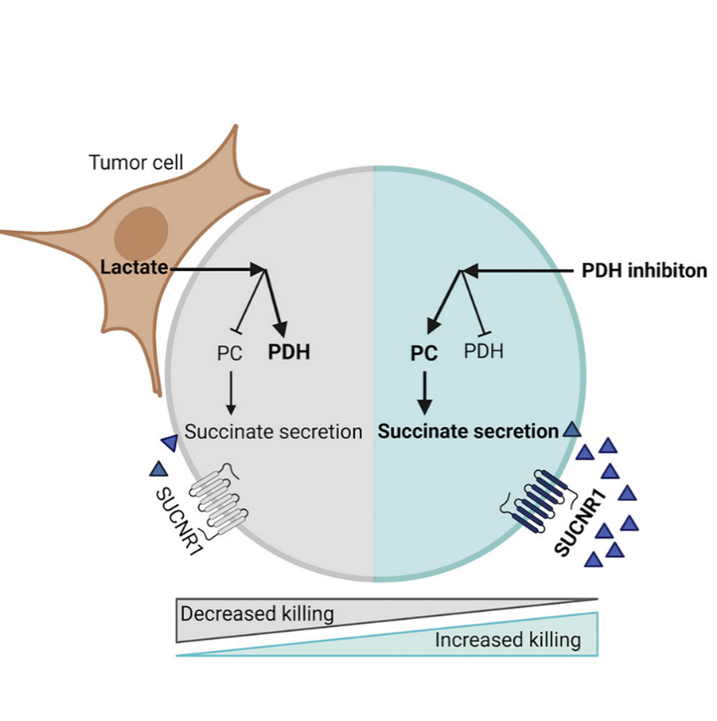 丙酮酸和琥珀酸:哈佛醫(yī)學(xué)院的Marcia C. Haigis課題組和Arlene H. Sharpe課題組于2022年8月在Cell Metabolism雜志上發(fā)表了題為“Tumor cells dictate anti-tumor immune responses by altering pyruvate utilization and succinate signaling in CD8+ T cells”的文章(DOI: 10.1016/j.cmet.2022.06.008),發(fā)現(xiàn)腫瘤來源的乳酸改變了T細(xì)胞的代謝,導(dǎo)致CD8+T細(xì)胞中丙酮酸羧化酶(PC)活性降低,抑制了T細(xì)胞的細(xì)胞毒性。乳酸也改變了丙酮酸進(jìn)入TCA循環(huán)的途徑,從PC重定向到丙酮酸脫氫酶(PDH)。PDH的抑制增加了PC活性和琥珀酸分泌,從而激活琥珀酸分泌和琥珀酸受體1(SUCNR1),增強(qiáng)T細(xì)胞的抗腫瘤細(xì)胞作用。