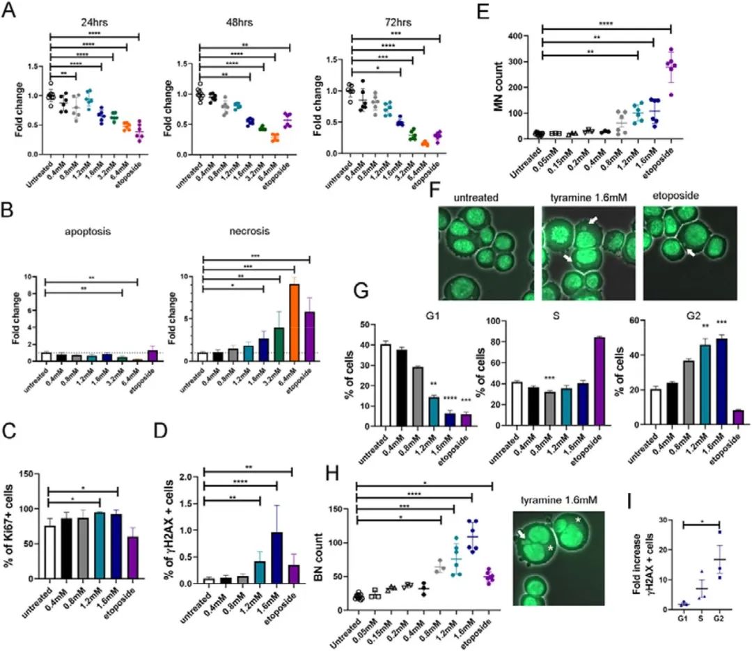 已知細(xì)胞增殖和DNA不穩(wěn)定性增加是腫瘤發(fā)生的危險(xiǎn)因素,因此,作者探究酪胺是否會(huì)影響細(xì)胞增值和誘導(dǎo)DNA損傷。與對(duì)照組相比,用1.2和1.6 mM的酪胺處理24h后,Ki67陽性細(xì)胞占比明顯升高(圖1C),磷酸化組蛋白 H2AX細(xì)胞形成γH2AX的頻率明顯更高(圖1D),表明細(xì)胞對(duì)DNA雙鏈斷裂的誘導(dǎo)有反應(yīng)。此外,作者使用MN試驗(yàn)評(píng)估酪胺誘導(dǎo)的 DNA 損傷,用1.2和1.6 mM的酪胺處理誘導(dǎo)了MN(微核)的形成(圖1E和1F),表明DNA損傷和染色體畸變的增加。作者在酪胺治療后6h計(jì)數(shù)γH2AX 陽性細(xì)胞,酪胺未誘導(dǎo)顯著的基因毒性效應(yīng)。