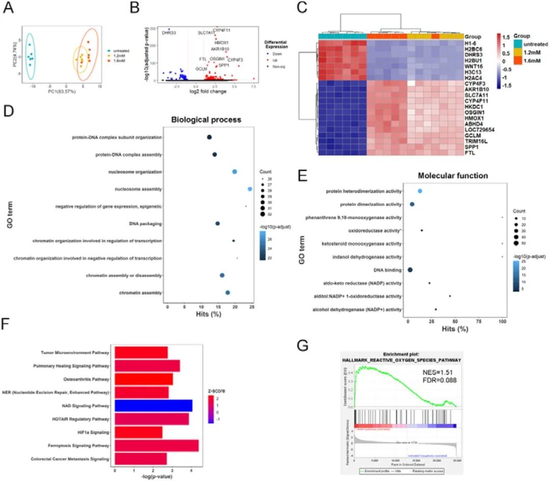 為了探究酪胺的作用機(jī)理,作者將對(duì)照組和酪胺處理組(1.2和1.6 mM處理24h)的細(xì)胞進(jìn)行了RNA測(cè)序。基因表達(dá)譜的PCA圖表明這兩組細(xì)胞間存在顯著差異(圖2A),兩種劑量的酪胺誘導(dǎo)了類似的細(xì)胞反應(yīng)模式,但低劑量組的程度較低。與對(duì)照組相比,在1.6 mM和1.2 mM酪胺處理的細(xì)胞中,總共有524個(gè)和241個(gè)差異表達(dá)的基因(圖2B)。熱圖展示了對(duì)照組和酪胺處理組基因表達(dá)的差異,主要是組蛋白基因下調(diào)以及參與氧化/還原反應(yīng)和氧化應(yīng)激反應(yīng)的基因上調(diào)(圖2C)。