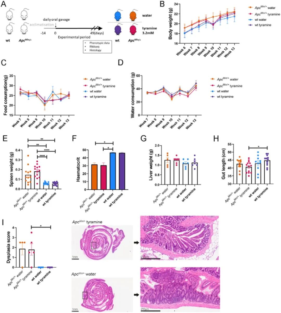 基于以上研究結(jié)果,作者進(jìn)一步在ApcMin/+小鼠體內(nèi)探究酪胺對(duì)CRC發(fā)展的影響(圖3A)。小鼠的體重、食物攝入、飲水在整個(gè)研究的各組間無顯著性差異(圖3B-D)。與野生型對(duì)照組相比,無論給藥方案如何,ApcMin/+小鼠脾臟重量顯著增加,血細(xì)胞比容顯著降低(圖3E-F)。然而,各組間的肝臟重量相當(dāng)(圖3G)。酪胺給藥的小鼠,ApcMin/+小鼠的腸道比WT小鼠腸道更短(圖3H),表明酪胺和小鼠的遺傳菌株之間存在相互作用導(dǎo)致腸道長(zhǎng)度的這種表型變化。組織學(xué)分析表明,CRC易感小鼠的不典型增生程度相似,與用藥無關(guān),酪胺給藥不會(huì)導(dǎo)致組織學(xué)變化(圖3I)。