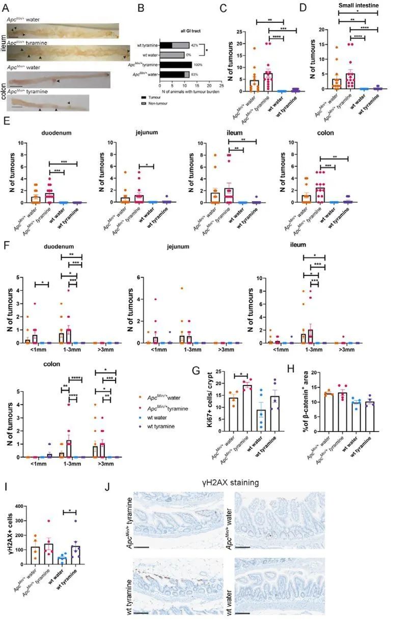 作者的研究報(bào)道了酪胺對(duì)HCT116細(xì)胞具有細(xì)胞毒性和基因毒性,并誘導(dǎo)細(xì)胞周期停滯和細(xì)胞壞死。參與染色體組織和氧化應(yīng)激的基因表達(dá)水平在酪胺處理的HCT116細(xì)胞中上調(diào)。作者在ApcMin/+小鼠的體內(nèi)實(shí)驗(yàn)表明,酪胺顯著加劇了腫瘤發(fā)生,誘導(dǎo)了促炎反應(yīng)并增加了細(xì)胞增殖(圖7D)。最重要的是,在用酪胺給藥的小部分WT小鼠中,酪胺誘導(dǎo)了更高水平的DNA損傷,伴隨著細(xì)胞增殖和腫瘤發(fā)生增加的趨勢(shì)。