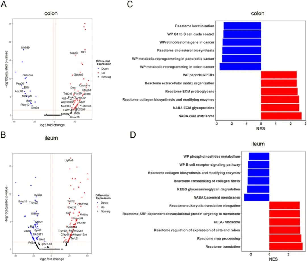 GSEA通路分析顯示,給藥酪胺后,結(jié)腸組織中參與細(xì)胞外基質(zhì)組織的基因富集,線粒體活性基因表達(dá)降低。相反,回腸中細(xì)胞外基質(zhì)組織通路和膠原蛋白生物合成通路下調(diào),表明腸道上皮屏障的變化(圖5C-D)。結(jié)腸和回腸中觀察到的差異歸因于它的生理差異及酪胺與腸道內(nèi)相關(guān)受體的結(jié)合差異。在給藥組,包括細(xì)胞外基質(zhì)糖蛋白和基底膜的通路均下調(diào),表明腫瘤中上皮間質(zhì)轉(zhuǎn)化和骨髓對(duì)周圍基質(zhì)的侵襲。
