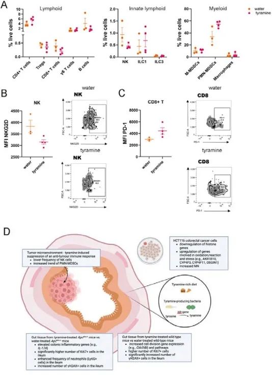 酪胺已被證明可以增加巨噬細(xì)胞中炎癥基因的表達(dá),因此,作者使用流式細(xì)胞術(shù)進(jìn)一步研究回腸和結(jié)腸腫瘤中免疫細(xì)胞亞群的功能。作者在結(jié)腸腫瘤浸潤(rùn)淋巴細(xì)胞(TIL)中的淋巴、先天淋巴和骨髓細(xì)胞中觀察到相似的頻率,但NK細(xì)胞和多形核骨髓源性抑制細(xì)胞(PMN-MDSC)除外(圖7A)。與水處理的 ApcMin/+小鼠相比,酪胺給藥的NK細(xì)胞頻率較低,這伴隨著腫瘤微環(huán)境NK細(xì)胞中NKG2D的平均熒光強(qiáng)度(MFI)的降低(圖7B),表明酪胺可能會(huì)在腫瘤發(fā)生的早期階段損害有效的抗腫瘤反應(yīng)。此外,抑制標(biāo)記物PD-1的MFI在CD8+ T細(xì)胞中顯示出較高的頻率,但未達(dá)到統(tǒng)計(jì)學(xué)顯著性(圖7C),表明既往細(xì)胞毒性CD8+ T細(xì)胞活化和潛在耗竭。研究結(jié)果表明,酪胺抑制抗腫瘤免疫反應(yīng),促進(jìn)腫瘤發(fā)展。