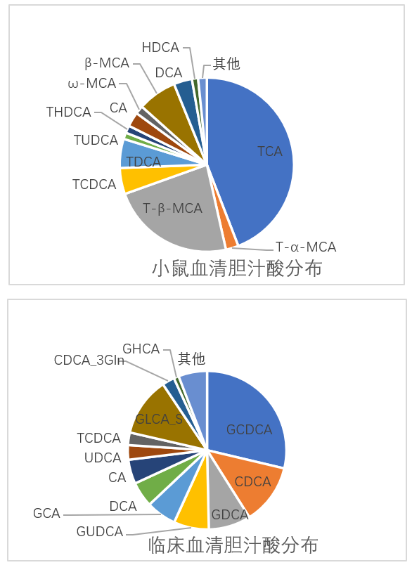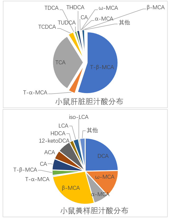 人類肝臟合成的初級膽汁酸主要包括CA、CDCA及其與甘氨酸、;撬峤Y合形成的GCA、GCDCA、TCA和TCDCA。而嚙齒動物合成的主要初級膽汁酸包括CA、MCA以及牛磺酸結合形成的TCA、T-α-MCA和 T-β-MCA。