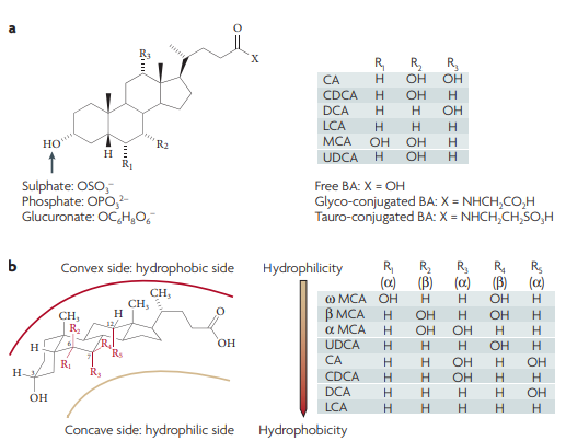 膽汁酸是來自膽固醇分解代謝的可溶性產物。一般來說,膽汁酸由形成烴晶格的四個類固醇環和短的五碳酸性側鏈組成,所述烴晶格具有包含羥基的凸起疏水面和凹陷親水面,所述側鏈隨后與;撬峄蚋拾彼狨0坊_@種兩親結構賦予膽汁酸洗滌劑的性質,允許膠束形成,并促進小腸對膳食脂質和脂溶性維生素A、D、E和K的消化和吸收。類固醇骨架上3、6、7和12位的α或β方向上羥基的存在或缺失影響它們的溶解性和疏水性(從疏水性到親水性的等級順序為:LCA > DCA(脫氧膽酸) > CDCA > CA > UDCA > MCA)。