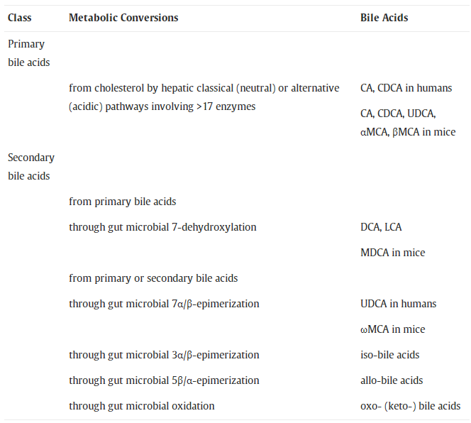 膽汁酸從來源上可分為初級膽汁酸(Primary bile acids)和次級膽汁酸(Secondary bile acid)。肝細胞內,以膽固醇為原料直接合成的膽汁酸稱為初級膽汁酸。初級膽汁酸會被腸道微生物去共軛、去羧基、脫氫、差向異構等,形成次級膽汁酸。