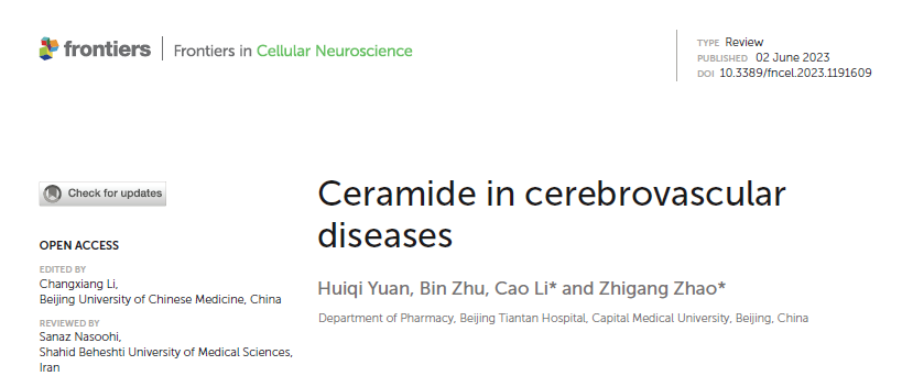 首都醫科大學附屬北京天壇醫院的趙志剛研究團隊于2023年6月在Frontiers in Cellular Neuroscience期刊上發表題為“Ceramide in cerebrovascular diseases”的綜述,對神經酰胺的生物合成、在疾病發生發展過程中的水平變化、在不同細胞中的表達及機制等進行了詳細闡述和探索。原文鏈接:https://doi.org/10.3389/fncel.2023.1191609。