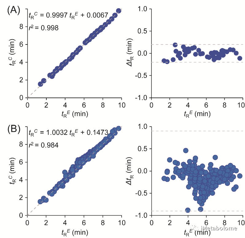 圖2(A)45個酰基肉堿標準品與(B)生物樣品中檢測到的酰基肉堿模型計算保留時間(tRC)與實驗結果(tRE)的比較。