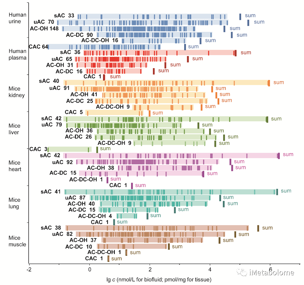 在2種典型的人源生物液體(血漿和尿液)和5種小鼠組織(腎臟、肝臟、心臟、肺和肌肉)中共定量出514種酰基肉堿,用于表征其酰基肉堿分子表型。其中,人源尿液樣本中含有421種酰基肉堿多于人源血漿(149種)和小鼠組織(包括腎211種、肝195種、心臟189種、肺188種與肌肉169種),特別是共軛酰基肉堿與含有羥基和羧基的酰基肉堿。