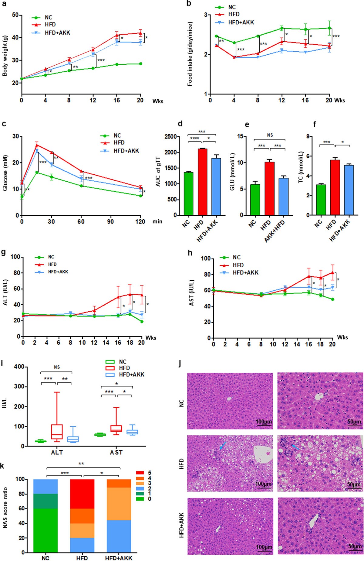 基線血清生化特征數(shù)據(jù),包括ALT、AST、TC、TG、LDL-C、HDL-C和GLU,顯示三組小鼠之間無顯著差異,表明各組之間基礎(chǔ)狀況正常化。與喂食對(duì)照飼料的小鼠相比,高脂飲食(HFD)四周后小鼠體重明顯增加,但攝食量減少,在實(shí)驗(yàn)的第16周,A.嗜粘蛋白菌明顯降低HFD組小鼠的體重,但對(duì)攝食量沒有影響。此外,第8周的生化檢測結(jié)果表明,HFD可引起血清GLU和TC水平升高,而A.嗜粘蛋白菌沒有改善。第11周,A.嗜粘蛋白菌治療顯著改善了對(duì)葡萄糖給藥的反應(yīng)。第12周,A.嗜粘蛋白菌改善了小鼠血清GLU的水平,但沒有提高TC的水平。第18周,模型小鼠的血糖和總膽固醇均被A.嗜粘蛋白菌逆轉(zhuǎn)。第20周,與對(duì)照小鼠相比,在模型小鼠中發(fā)現(xiàn)ALT和AST水平增加,肝臟脂肪變性和炎性細(xì)胞浸潤增加,以及NAFLD活性評(píng)分(NAS)升高,在A.嗜粘蛋白菌治療處理后明顯改善。