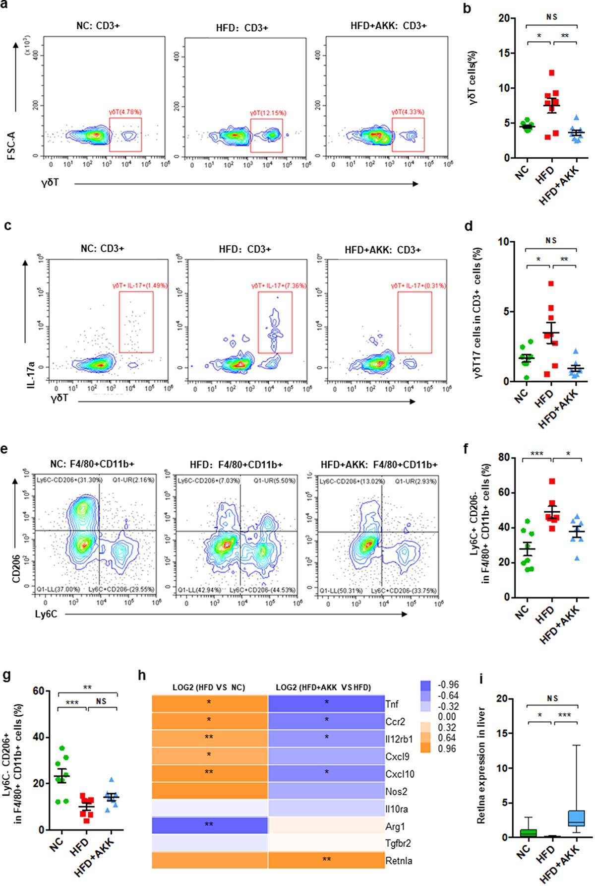 進(jìn)一步研究肝臟免疫反應(yīng),在NASH小鼠中分離肝臟單核細(xì)胞并在治療20周后進(jìn)行FACS。肝臟γδT細(xì)胞,產(chǎn)生IL-17的γδT細(xì)胞(γδT17細(xì)胞)和促炎性M1巨噬細(xì)胞(CD11b+F4/80+Ly6C+CD206−),以及CD3+t細(xì)胞和炎性NKT細(xì)胞在HFD誘導(dǎo)的NASH小鼠中富集。此外,與對(duì)照組小鼠相比,抗炎M2巨噬細(xì)胞(CD11b+F4/80+Ly6C−CD206+)在NASH小鼠的肝臟中減少。重要的是,A.粘蛋白菌給藥明顯抑制γδT細(xì)胞、γδT17細(xì)胞和M1細(xì)胞的累積,但對(duì)其他肝臟免疫細(xì)胞無明顯影響。此外,肝臟RNA-seq分析表明,HFD和HFD+AKK組小鼠的巨噬細(xì)胞極化標(biāo)記發(fā)生了變化。與對(duì)照組相比,HFD小鼠肝臟中M1標(biāo)記物(Tnf、Ccr 2、Cxcl 9和Cxcl 10)的基因表達(dá)增加,M2標(biāo)記物(Arg 1)的基因表達(dá)減少,這部分被A.嗜粘蛋白體利用。qRT-PCR分析顯示,與HFD組相比,A.嗜粘蛋白菌上調(diào)M2標(biāo)志物Retnla的表達(dá)。
