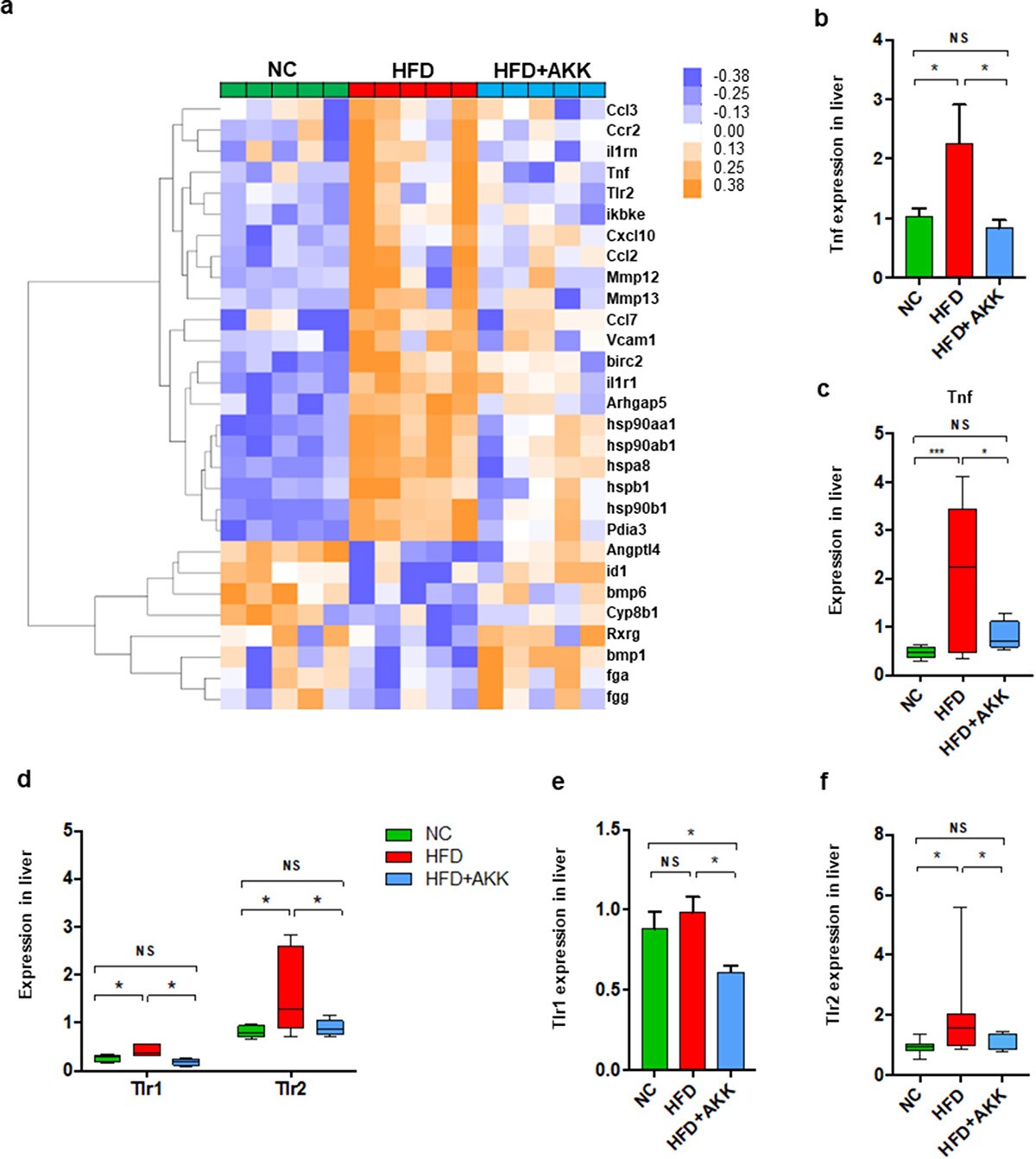為研究細(xì)菌致病成分或免疫代謝物對(duì)肝臟免疫反應(yīng)的影響,進(jìn)行了RNA測序(RNA-seq)分析。HFD小鼠肝臟炎癥標(biāo)記物(如Tnf、Ccl2、Ccl3、Ccl7和Hsp90)的表達(dá)高于對(duì)照組,這一現(xiàn)象A.粘蛋白菌被部分逆轉(zhuǎn)。qRT PCR分析證實(shí)A.粘蛋白菌下調(diào)HFD誘導(dǎo)的肝臟中Tnf表達(dá)的富集。進(jìn)一步分析了識(shí)別細(xì)菌致病成分(如TLRs和NODs)或免疫代謝物(如AhR、FRAR和FXR)的受體的肝臟基因表達(dá)。HFD飼養(yǎng)增加了肝臟TLR1、TLR2、TLR3和TLR7的基因表達(dá),降低了CD1d和FXR。A.粘蛋白菌僅在HFD小鼠的肝臟中逆轉(zhuǎn)了TLR1/2的基因表達(dá)。因此,假設(shè)A.粘蛋白菌NASH的發(fā)生可能是由于微生物來源的TLR2信號(hào)與肝臟巨噬細(xì)胞或γδT細(xì)胞之間的相互干擾。