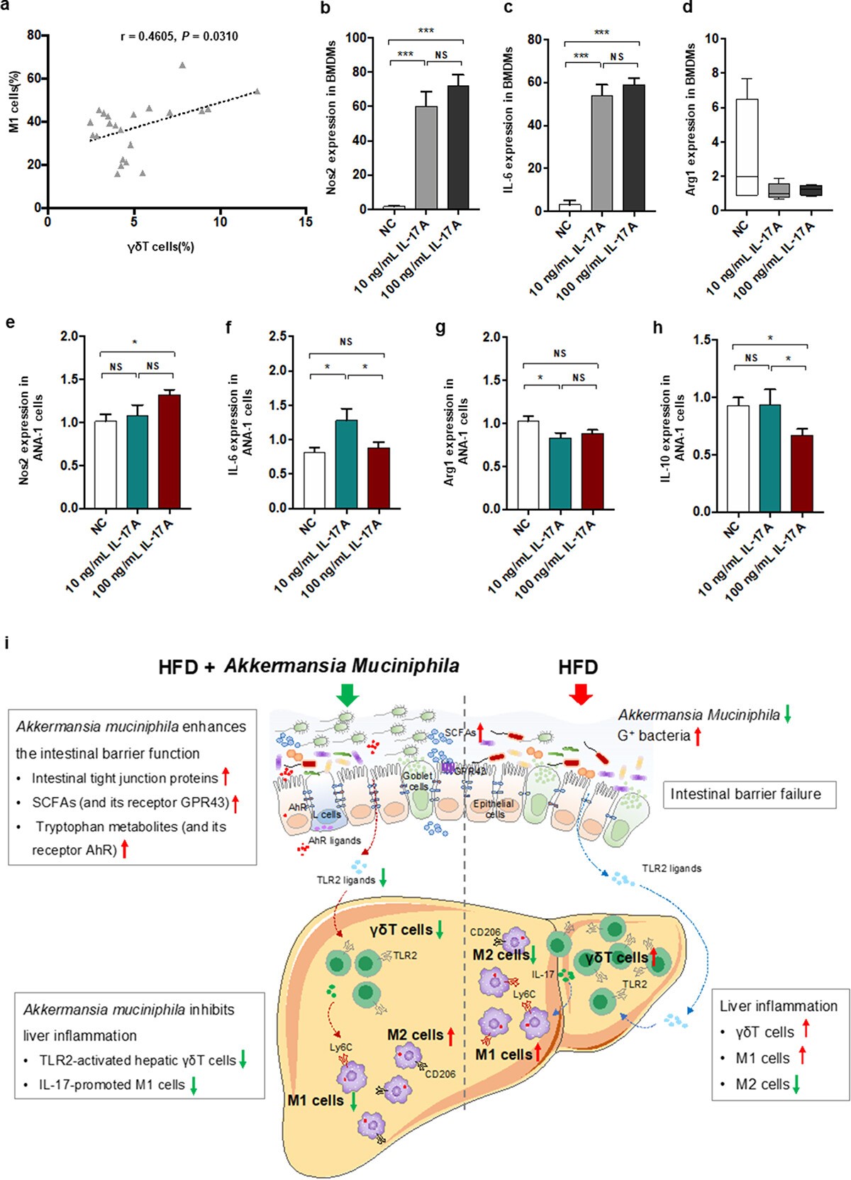 在NASH小鼠模型中,A.嗜粘蛋白菌通過調(diào)節(jié)γδT積聚和巨噬細(xì)胞極化來抑制肝臟炎癥。分析測量了肝臟γδT細(xì)胞和M1細(xì)胞的水平,發(fā)現(xiàn)肝臟γδT細(xì)胞與NASH小鼠中的M1細(xì)胞正相關(guān),表明γδT細(xì)胞在巨噬細(xì)胞極化中的作用。為了進(jìn)一步研究γδT細(xì)胞(一種主要類型的IL−17產(chǎn)生細(xì)胞)是否對(duì)巨噬細(xì)胞極化有任何調(diào)節(jié)作用,在體外用重組IL− 17 A刺激巨噬細(xì)胞。用10 ng/ mL或100 ng/mL重組IL-17 A刺激骨髓源性巨噬細(xì)胞(BMDM)細(xì)胞。IL-17顯著促進(jìn)BMDM的M1標(biāo)記物(Nos 2和IL-6)的基因表達(dá),并輕微影響M2標(biāo)記物(Arg-1)的基因表達(dá)。為了進(jìn)一步驗(yàn)證IL−17和巨噬細(xì)胞之間的相互作用,IL−17顯著促進(jìn)巨噬細(xì)胞Ana−1細(xì)胞M1標(biāo)志物(Nos 2和IL −6)的基因表達(dá),并持續(xù)抑制M2標(biāo)志物(Arg−1和IL−10)的基因表達(dá)。結(jié)果表明,IL-17可以促進(jìn)巨噬細(xì)胞極化成促炎性M1細(xì)胞,活化的γδT細(xì)胞可以通過IL-17促進(jìn)巨噬細(xì)胞極化,提示兩種肝臟先天免疫細(xì)胞之間存在直接聯(lián)系。