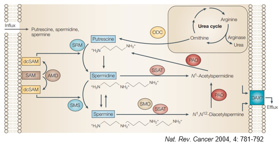下面進入我們的學術時間,多胺是廣泛存在于動植物體內,是一種具有兩個或多個氨基(-NH2 )的有機化合物,濃度極低,體內的合成受到嚴格地調控。鳥氨酸脫羧酶(ODC)是多胺合成途徑中的第一個酶,催化鳥氨酸(Ornithine)脫羧形成腐胺(Putrescine),腐胺與脫去羧基的SAM(dcSAM)反應,在亞精胺合酶(SRM)催化下生成亞精胺(Spermidine),這里dcSAM作為丙胺供體,而不是甲基供體,亞精胺在精胺合酶(SMS)催化下再一次獲得丙胺則生成精胺(Spermine)。尸胺(Cadaverine)的合成與上述三種多胺不同,它是賴氨酸(Lysine)在脫羧酶(LDC)作用下脫羧的產物。