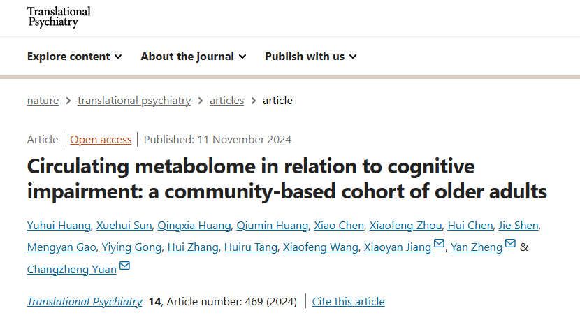 2024年11月,浙江大學袁長征研究員、復旦大學鄭琰研究員及復旦大學張曉燕研究員合作,共同在學術期刊《Translational Psychiatry》上發表了題為“Circulating metabolome in relation to cognitive impairment: a community-based cohort of older adults”的科技論文,尋找與認知障礙相關的血漿代謝物,并評估代謝物物組合的預測能力,原文鏈接:https://doi.org/10.1038/s41398-024-03147-9。