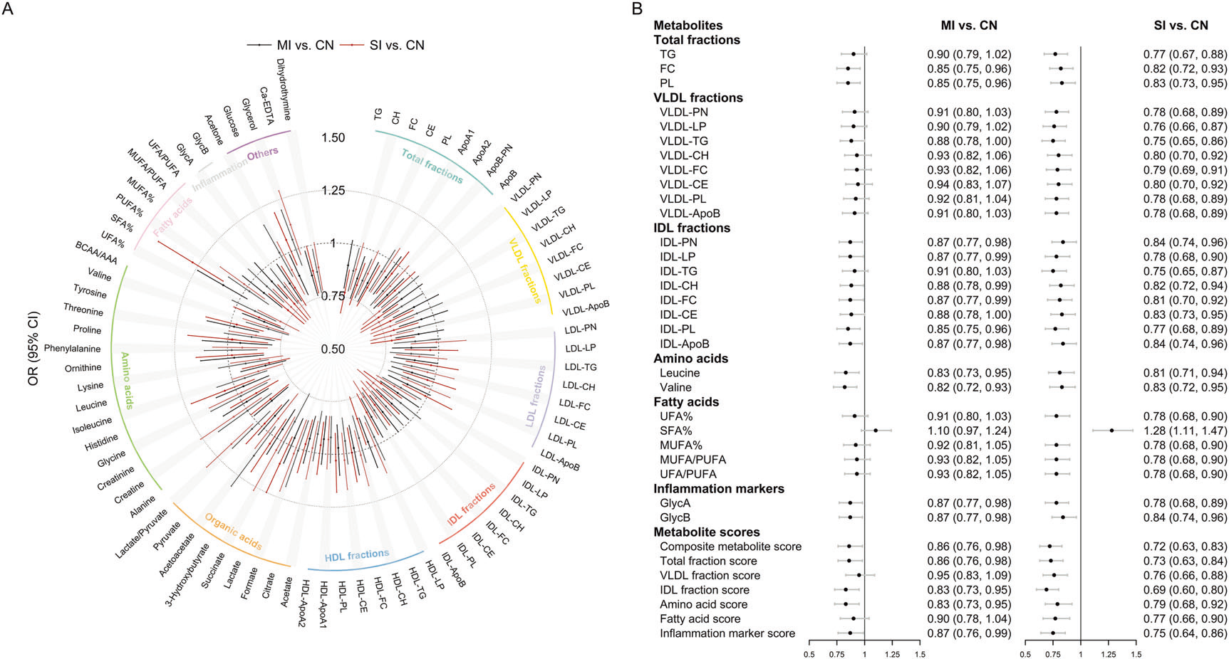 在橫斷面分析中,28種代謝物與重度認知障礙顯著相關,其中IDL顆粒數、IDL-ApoB、亮氨酸和纈氨酸在前瞻性分析中分別與29%、28%、33%的認知功能障礙風險降低相關。