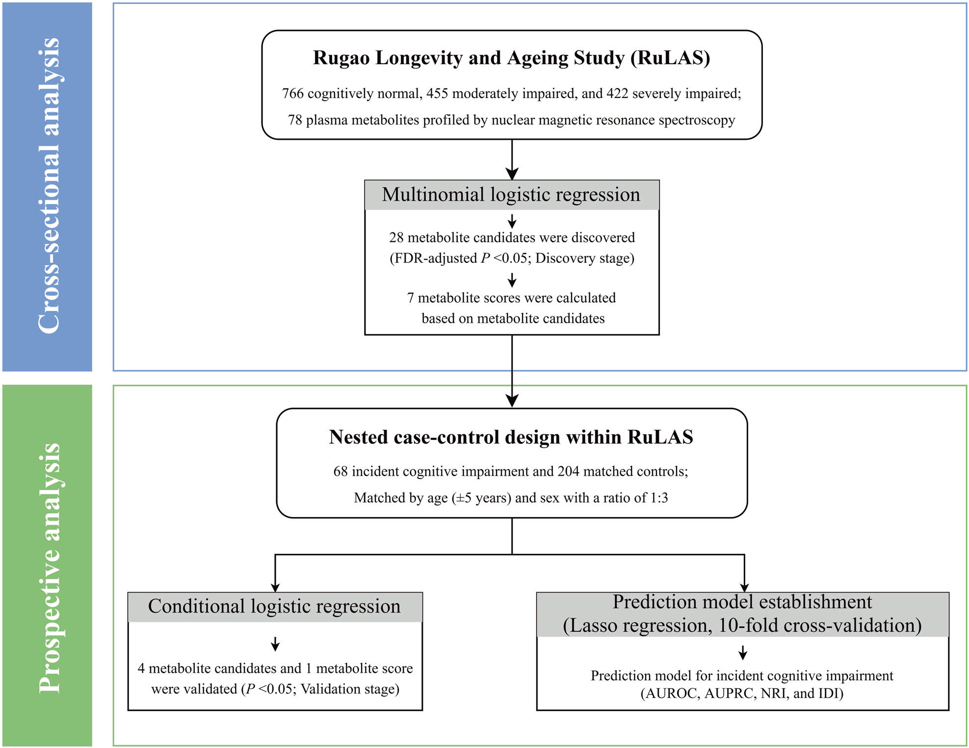 統計分析:采用多分類邏輯回歸(橫斷面)和條件邏輯回歸(前瞻性)分析代謝物與認知功能障礙的關聯,并使用Lasso回歸篩選代謝物標志物。